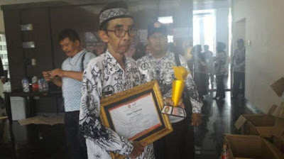 Kemeja batik putih khas PGRI yang dikenakannya terlihat lebih besar dari ukuran tubuhnya yang kurus. Kopiah hitamnya pun setia bertengger di atas kepalanya sedari pagi. Hari ini, ia adalah satu dari 17 guru yang mendapat piagam penghargaan dari PGRI.
